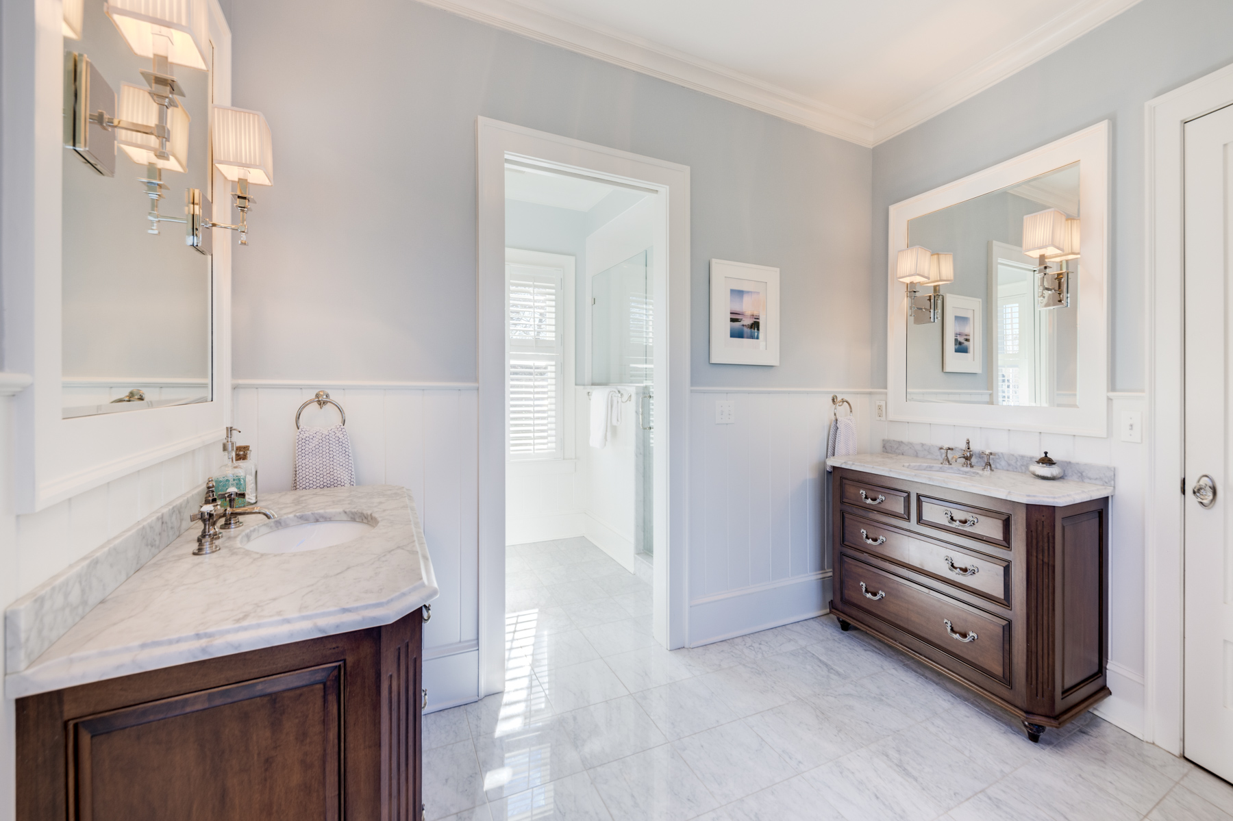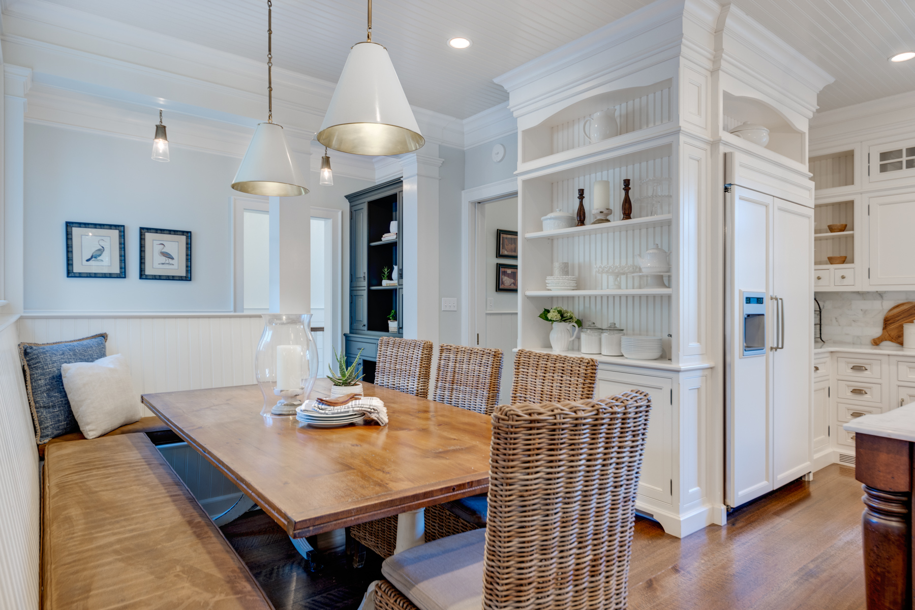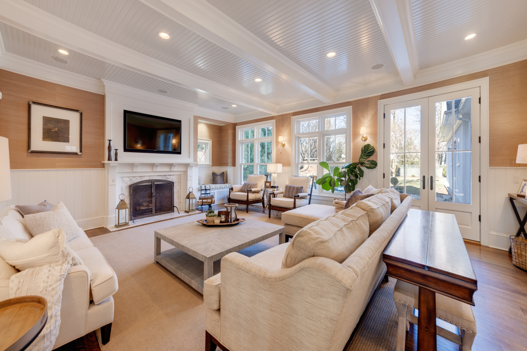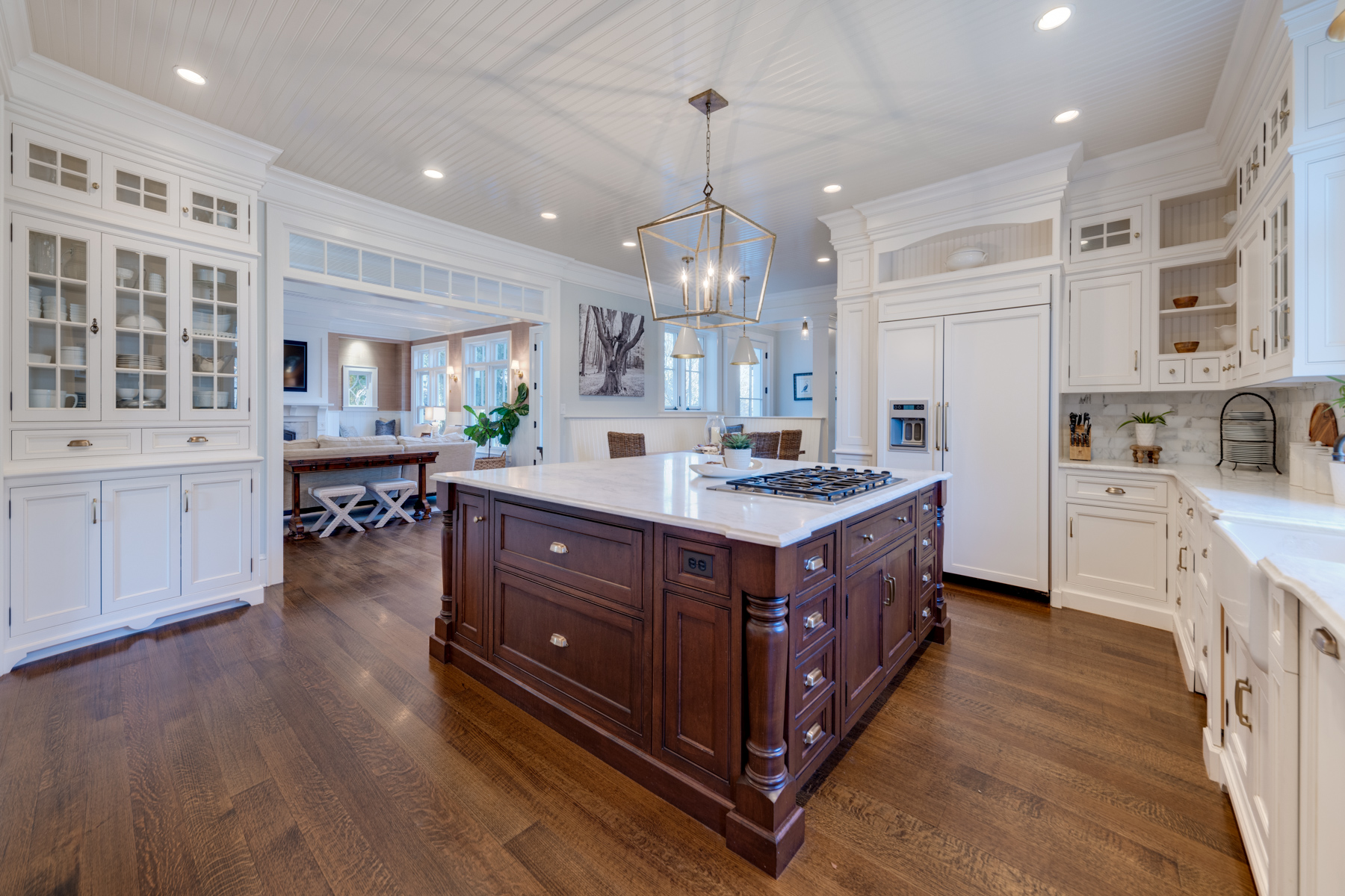 Graceful Living and Dining Rooms. Enormous Chef’s Dream Kitchen with Calacatta marble countertops, gorgeous custom cabinetry, immense island, top-of-the-line appliances, on-trend light fixtures and dreamy Breakfast Area. Kitchen opens to the GORGEOUS Family Room with beamed and beadboard ceiling, fireplace and farmhouse style double doors leading to the backyard.