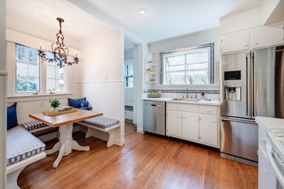 Enter through the traditional paneled Tudor-style door to find truly unique details at every turn. Walkthrough the Entry Vestibule, featuring two Coat Closets, into the bright Entry Foyer complete with distinctive plaster walls and ceilings, original hardwood floors, and an incredibly graceful staircase. Step through the original Tudor archway into the stunning Living Room featuring an out of this world soaring ceiling with rustic original beams and the home’s original stone fireplace. This room absolutely dazzles and is the perfect spot for spending time with friends or grand holiday celebrations. Dinner parties are ideal in the elegant Formal Dining Room complete with bright windows at two exposures and easy access to the neighboring Chef’s Kitchen. The Kitchen features crisp white cabinetry and countertops, top of the line stainless steel appliances, cheery tile, and a darling Banquette for family meals. Flow from the Kitchen to the warm and welcoming Family Room, bordered by stately original wood beams, and boasting a row of windows with serene views of the gardens beyond. Accessed from the Rear Hallway, don’t miss the lovely Patio that exudes relaxation and is well suited for an al fresco dinner party or simply sipping cocktails with friends. A well-appointed Powder Room rounds out the First Level.