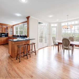 Dinner parties are divine in the elegant formal Dining Room complete with soothing gray hues, a charming chair rail and an inset ceiling. The stunning Gourmet Chef’s Kitchen is sure to satisfy every chef’s desire. An abundance of custom, warm wood cabinetry, sleek granite countertops and high-end stainless steel appliances are the best in form and function. Prepare to be overwhelmed by the light-infused adjacent Breakfast Area with a dramatic bay of floor to ceiling windows, expansive views and two sets of French doors leading out to a spectacular Deck. Off of the Kitchen Area, you are sure to be impressed by the beautiful Family Room. This room, which includes its own custom Wet Bar, exudes relaxation and is well suited for family game night, movie watching or cozy nights by the fireplace. Accessed from the Breakfast Room, enjoy the stunning wrap around Deck where you will literally feel like you are floating above the trees. Extensive landscaping, serious birdwatching and the out of this world views ensure magical get togethers for you and your guests. A tasteful Powder Room round out the First Level.