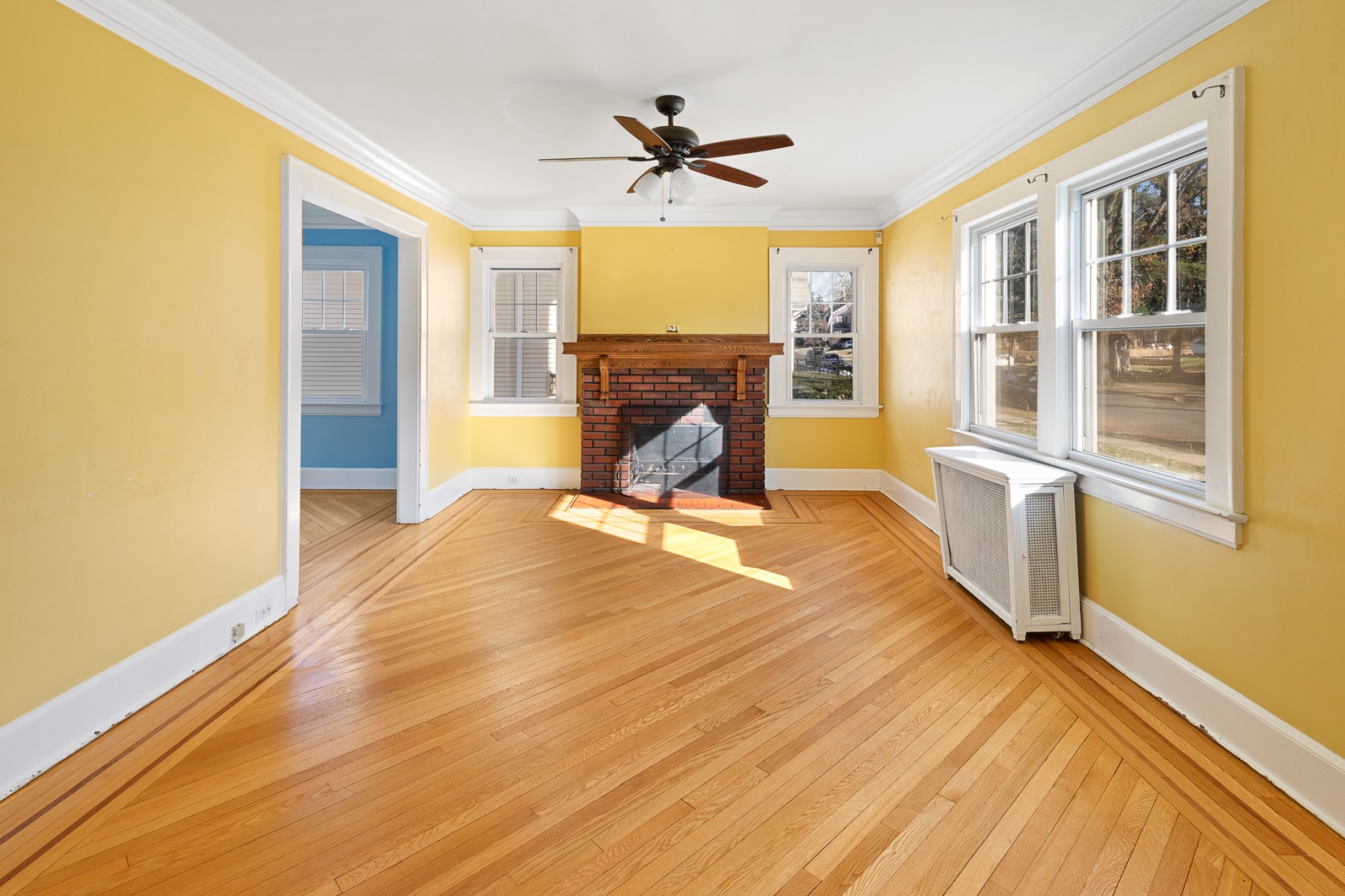 Amazing original architectural details intact such as hardwood floors with walnut inlay, deep crown and baseboard moldings and original fireplace. Sundrenched Living Room.