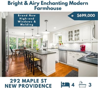 Enchanting 4 bedrooms, 3 Bath modern farmhouse with an out of this world Kitchen addition with sunny, open Eating Area. Entry with original coffered tin ceiling. Beautiful Living Room with beamed ceiling and original stone fireplace. Gorgeous Office with an abundance of light. First Level Bedroom. Out of this world Gourmet Chef’s Kitchen – perfect for entertaining with crisp white cabinetry, Italian soapstone countertops, and top of the line Thermador/Bosch appliances! Dreamy Breakfast Room encased by windows. Amazing Laundry/Mud Room. All bedrooms are bright and airy. All bathrooms are tasteful. Glorious Front Porch for rocking chairs and lemonade. Close to highly rated schools and zoned for sought after Salt Brook Elementary, NYC train, shopping, and restaurants in New Providence and Summit. 292 Maple is a gem that won’t last!