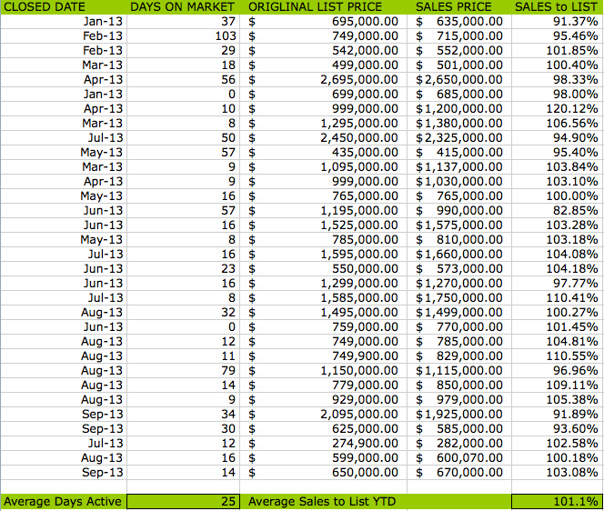 Here are Sue Adler Team 2013 listings sold showing days on market (DOM) and year-to-date list to sales price ratio. It’s all about market insight, experience and strategy.